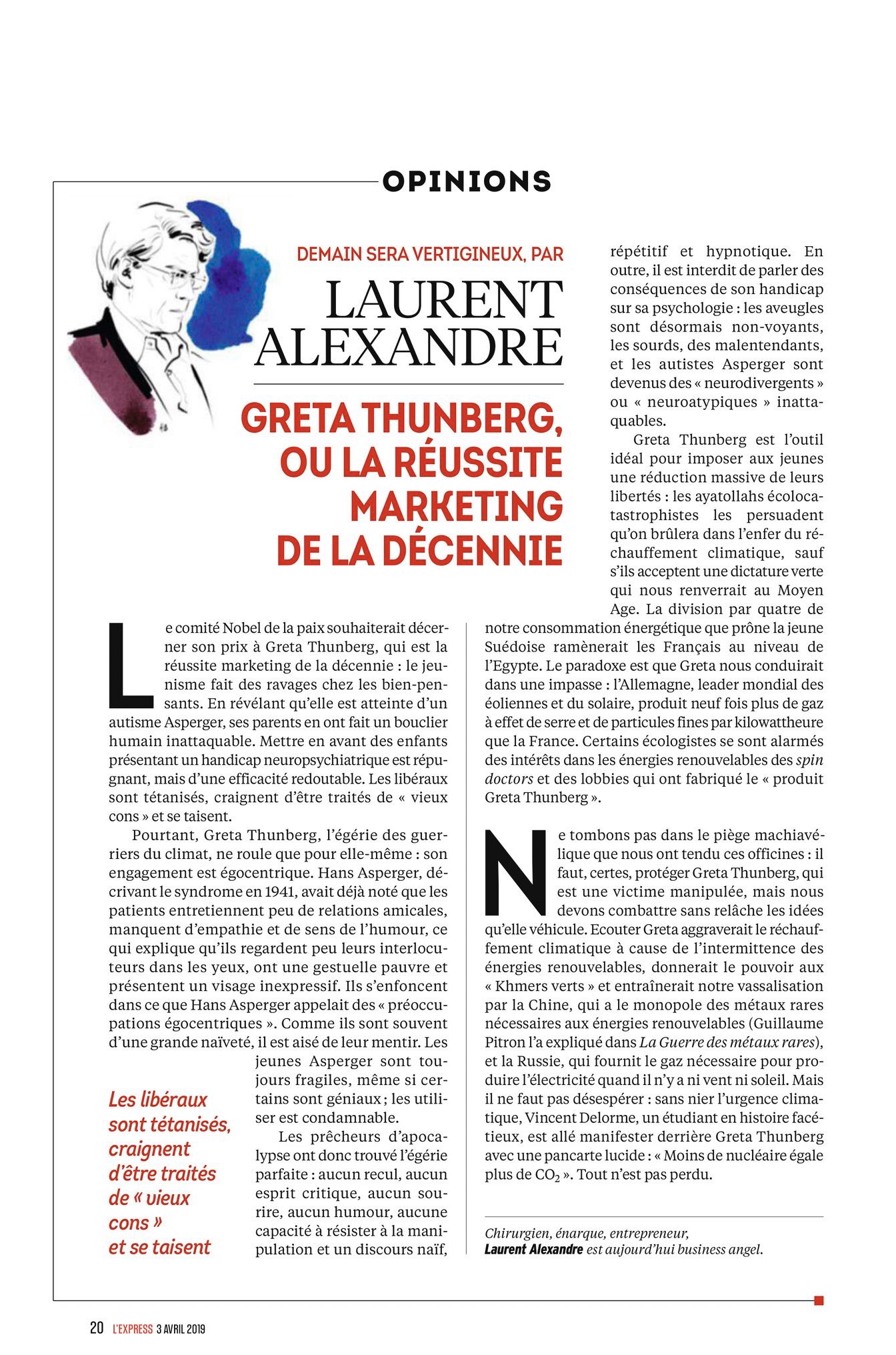 Dans le paysage médiatique, ce chirurgien-urologue, essayiste, entrepreneur, business angel, co-fondateur de Doctissimo est parti en croisade contre cette ado qui représente tout ce qu'il exècre. Il tremble pour sa 5G, la croissance économique, etc.